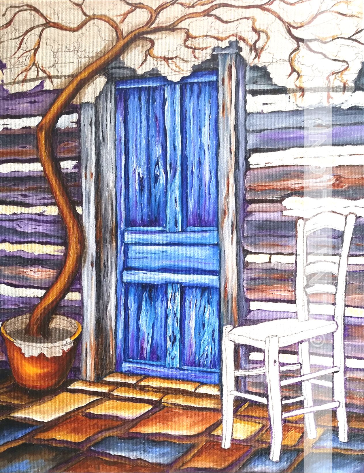 Learn to paint a “Blue Door in a Log Cabin”. A blue door embraced by a pink bougainvillea from the beautiful mountains of North Carolina