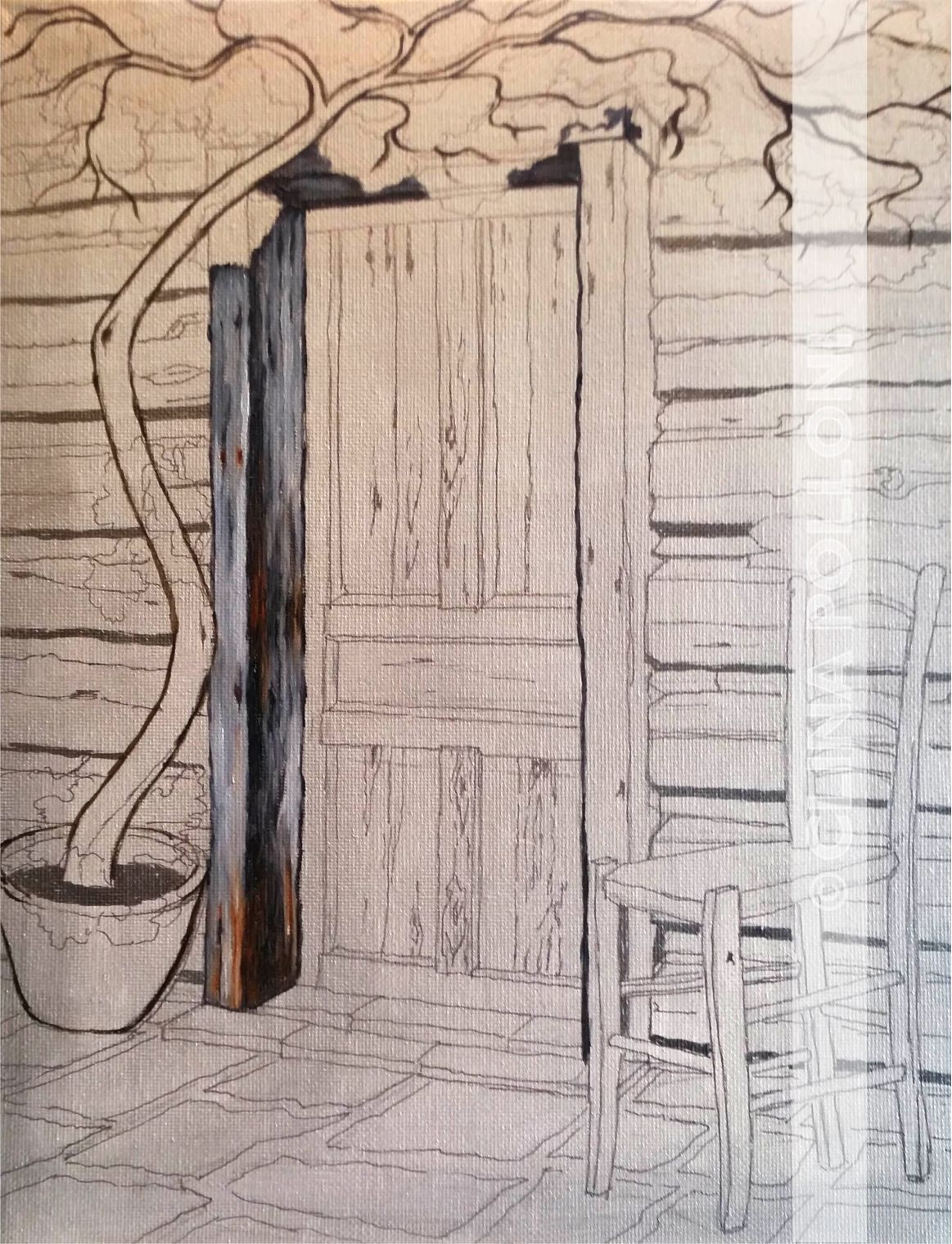 - Start by drawing the log cabin, the door, the chair and finally the bougainvillea. Put attention to the interesting shapes of the old wood.