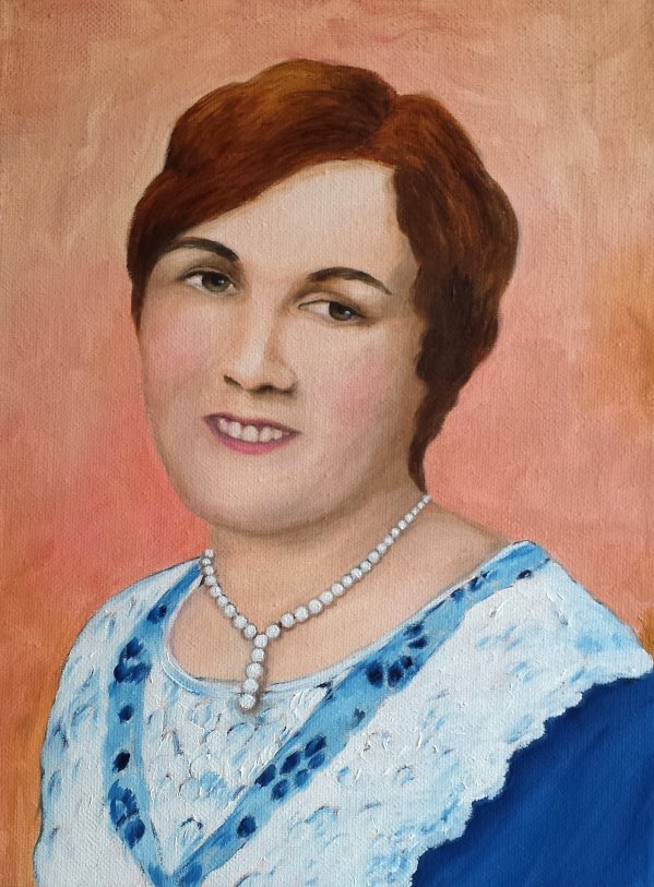 For the next painting: “I was commissioned by my friend Ginger to paint an oil portrait of her grand mother from an old photo.”