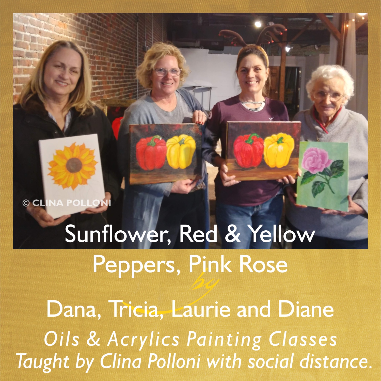 Dana with her Sunflower painting, Tricia and Laurie finished their Red and Yellow Peppers and Diane also finished her Pink Rose.