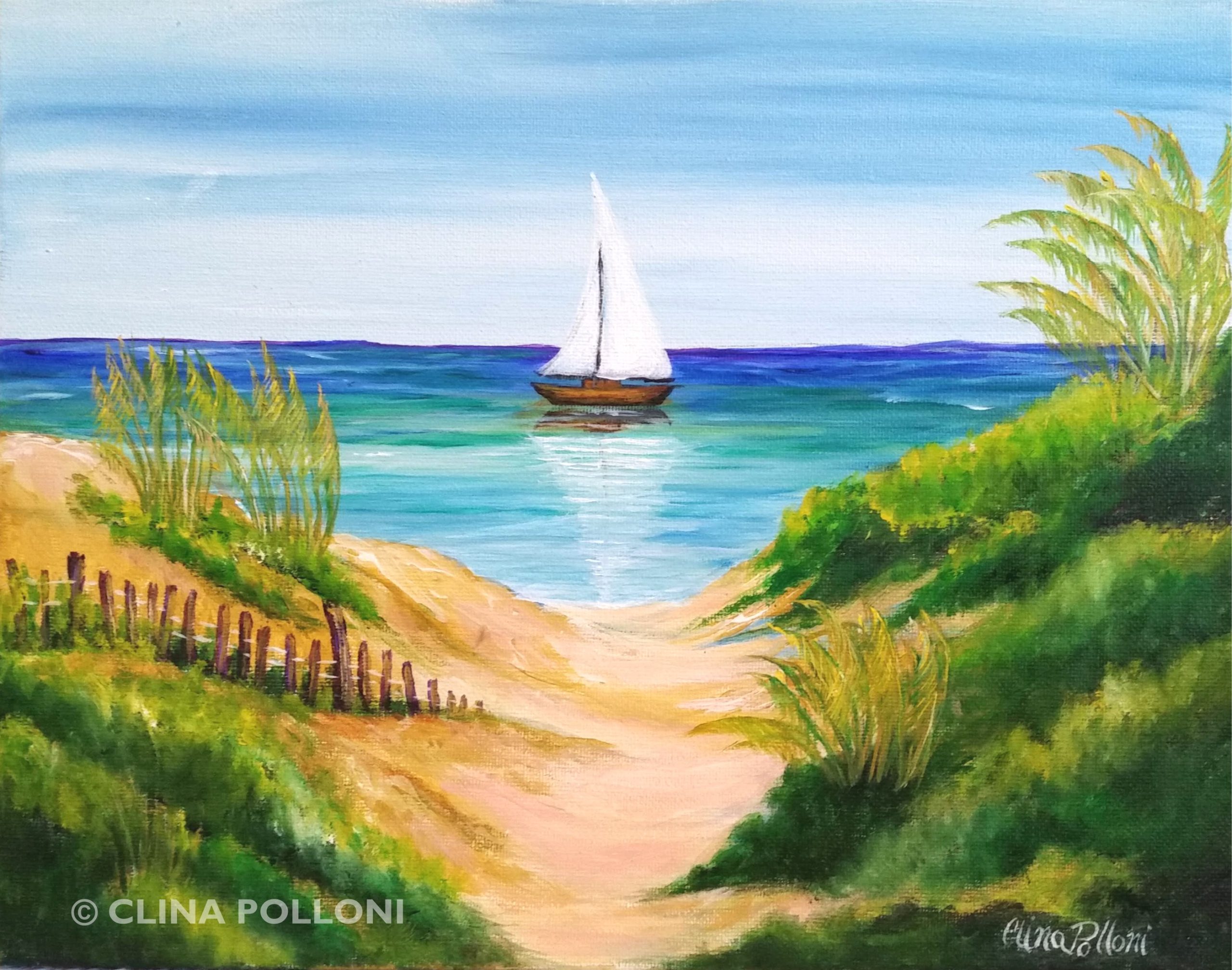 The Sea Dunes with Sail Boat Painting is © Clina Polloni.