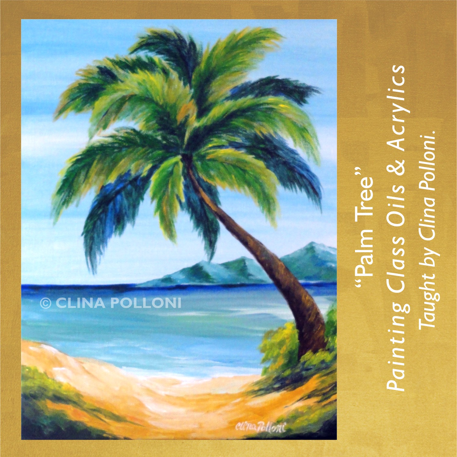 Palm Tree: 11″x 14″. Learn to paint a palm tree at the beach with clear waters of the ocean, is a simple and charming seascape for a person that is starting to paint. Supply >>