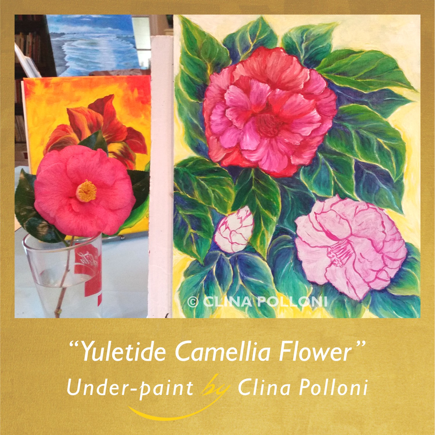 Drawing, under-paint and painting: Go to your yard to pick a fresh camellia flower, draw it with pencil and continue with acrylics, improving your drawing and covering the canvas. Finally paint over with oils.