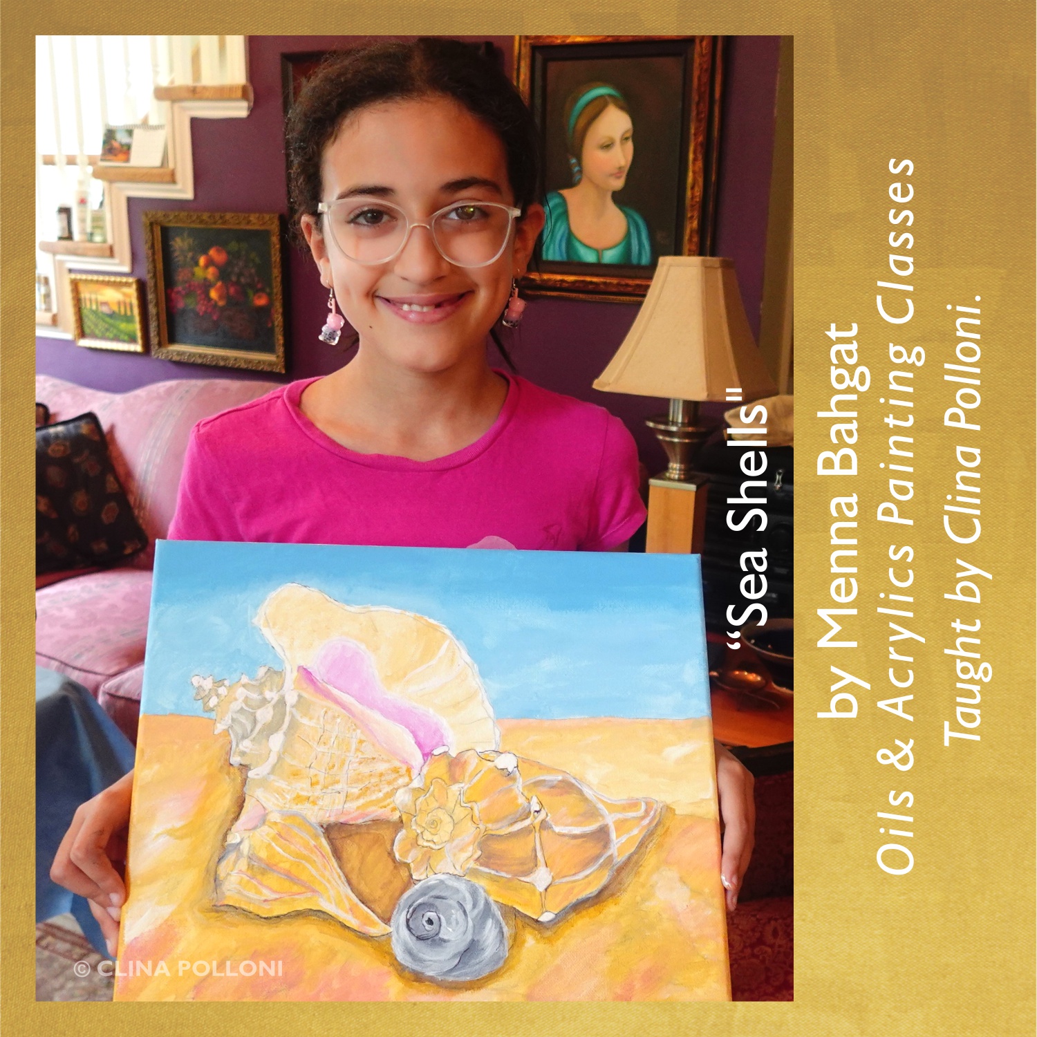 The “Sea Shells” painting is © Clina Polloni.