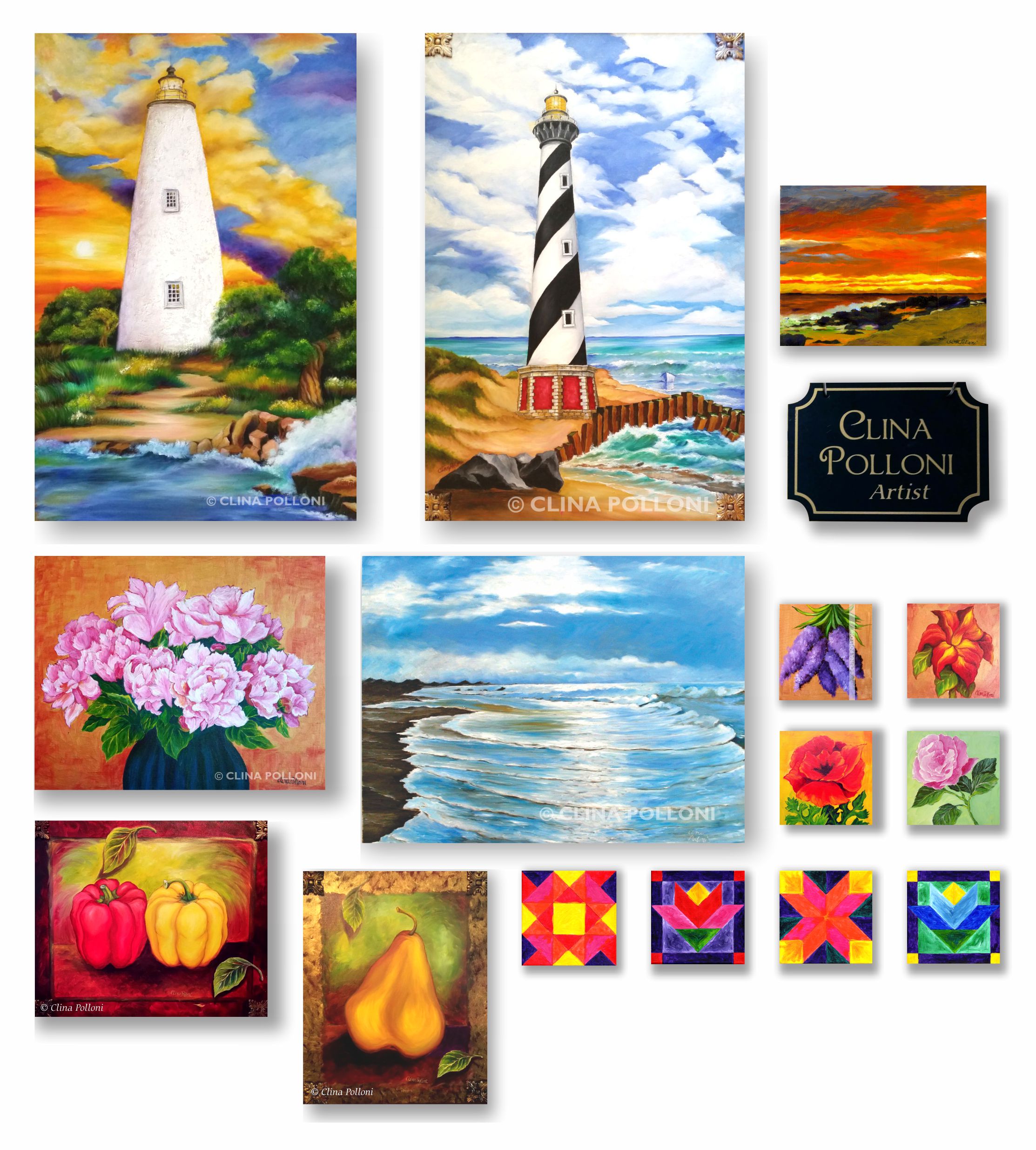 From reproductions of original oil paintings by Clina Polloni. Painting North Carolina and the world. Landscapes, Seascapes, Still Life and Flowers.